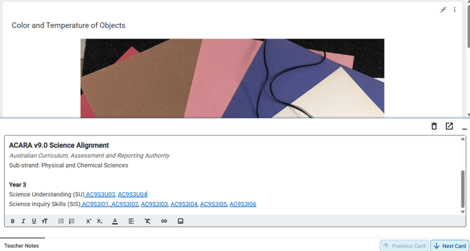 ACARA and other standards alignment can often be found in the Teacher Notes of the first card in a Notebook Lesson. Click the Teacher Notes icon in the top right corner of a card to view them.